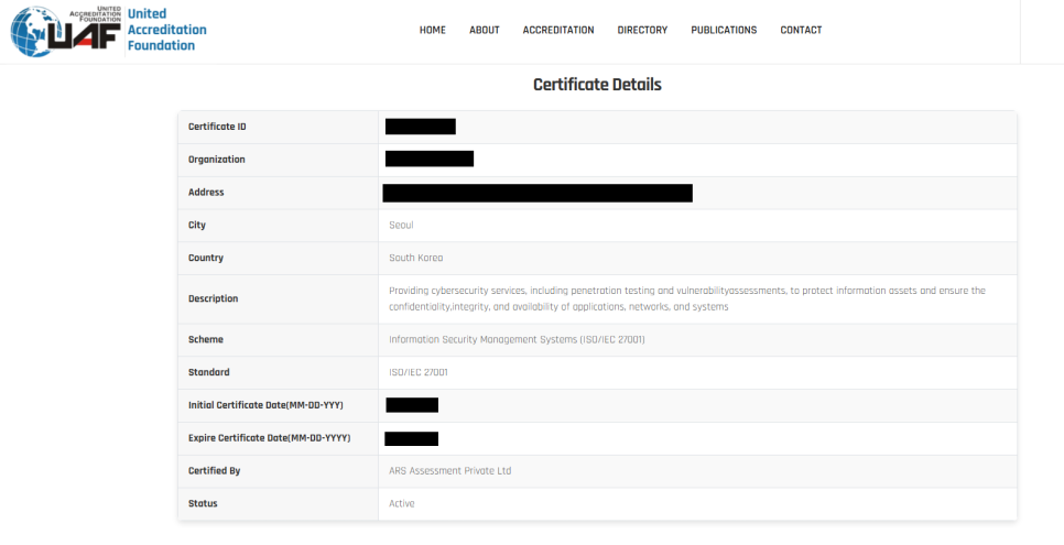 와이즈컴퍼니(주)를 통해 취득한 인증서는 아래 공식 국제 인증 조회 사이트에서 확인 가능한 정식 인증입니다.